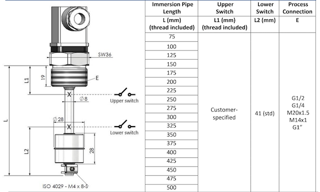 The float-level detector AFS 110 is designed for vertical insertion into a tank or well for full immersion in the fluid. The float, at the end of a rod of up to 500 mm, detects when the level of the tank becomes low. The wiring is via a sealed cable or connector.