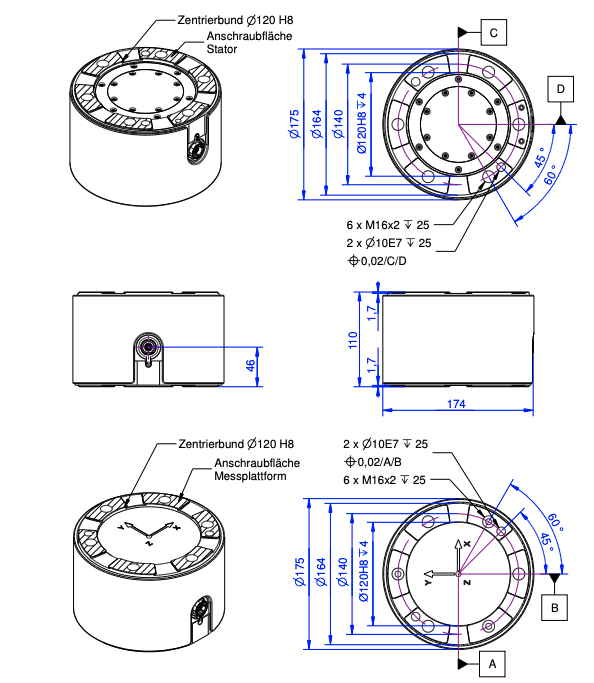 - Mounting and centering: 6 x M16x1.2 threads + 2 x Ø10 mm F7 holes