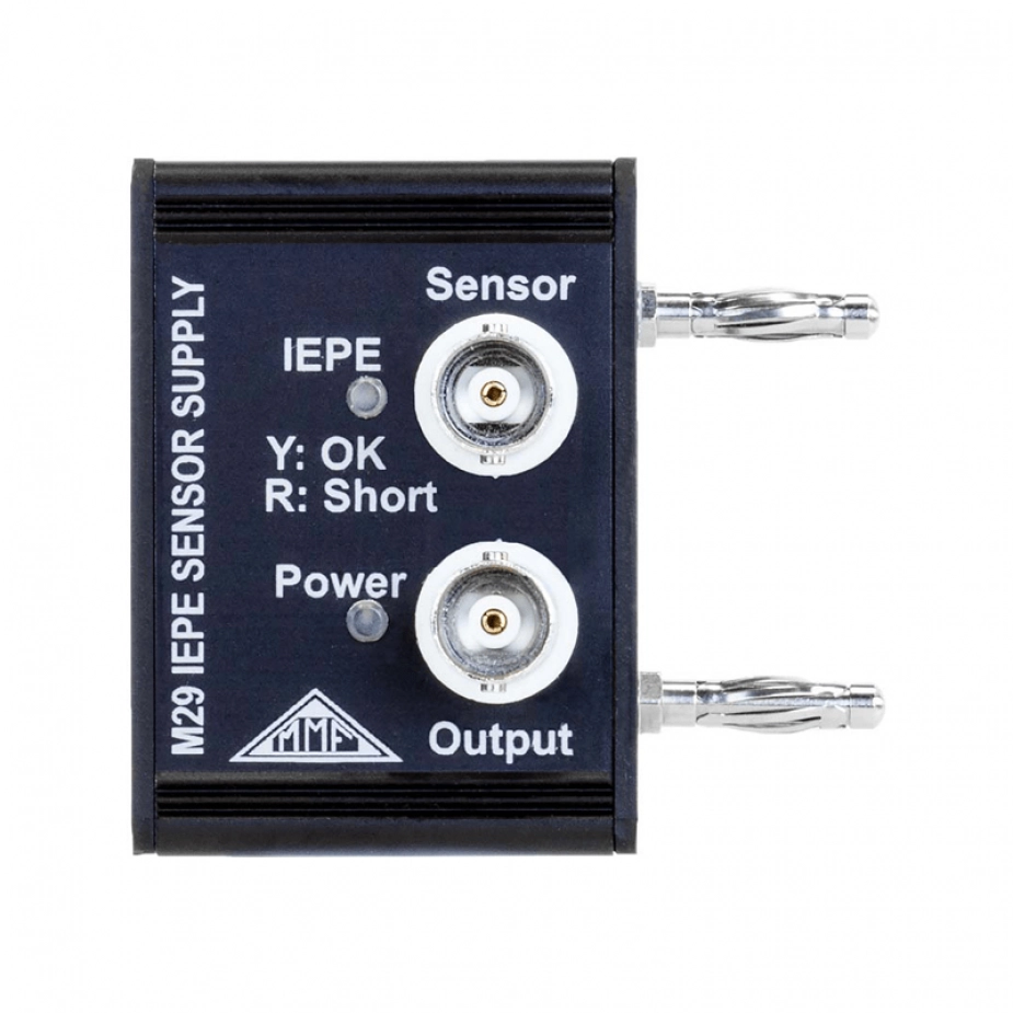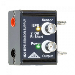 The M29 IEPE power supply module is designed to connect piezoelectric sensors to a display or data acquisition system without IEPE inputs. The M29 module powers the sensor electronics and decouples the DC components from the sensor signal.