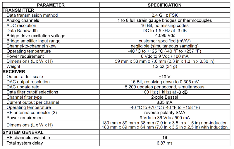 The system’s multi-channel receiver is designed with RF diversity and error checking to prevent data loss and corruption due to reflections or shadowed transmissions. Output data is provided as high-level ±10 V analog for direct interface with most data acquisition systems. Analog output options include additional choices for data cutoff frequencies and adjustment of zero offset. Transmitter and receiver status is provided by LED indicators on the receiver’s front panel as well as analog output signals that can be monitored for quality of transmission, low power conditions, and shunt status at the transmitter.