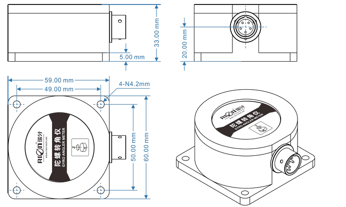 The TL-610D gyroscope is characterized by its very small size (60 x 59 x 33 mm), high shock resistance (200 g in operation), and industrial-grade design. It has an aluminum casing weighing 110 grams, with an IP67 protection rating. It is mounted using four M4 threaded holes. The supply voltage is 9-36V.